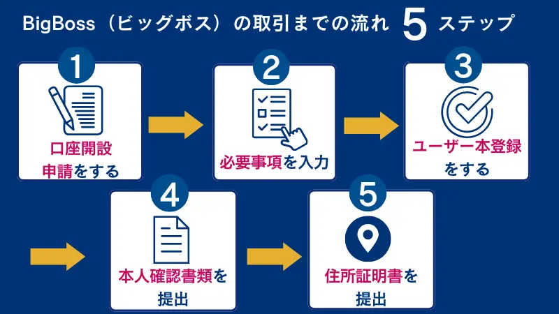 これからはじめてBigBoss(ビッグボス)を利用する人のために、BigBossのアカウントを登録し、実際にトレードができるようになるまでの流れを解説します。