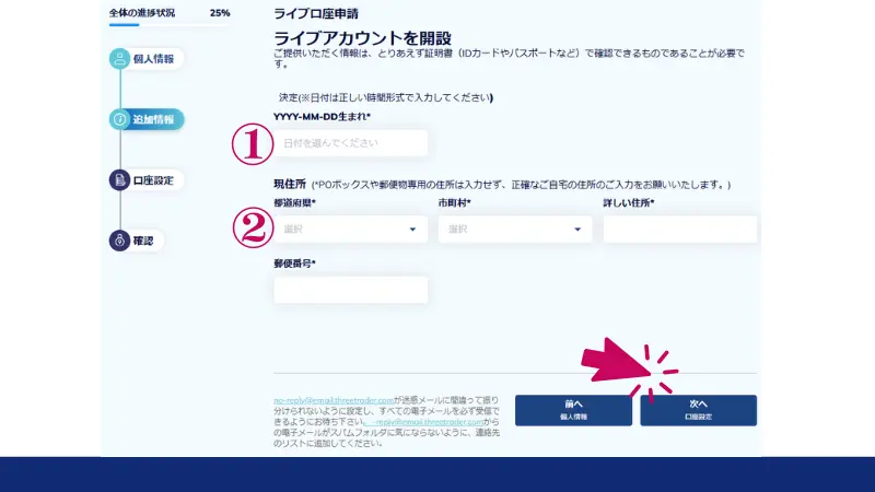 個人情報の入力が完了すると、次に追加情報を入力する画面が表示されます。このステップでは、生年月日と現住所を入力します。フォームに従い、上から順番に情報を正確に入力してください。