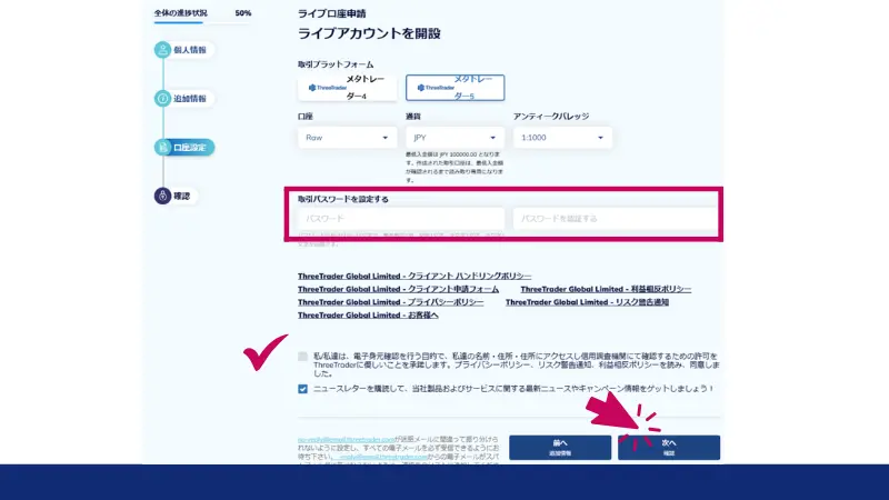 すべての項目を正確に入力したら、画面下部にある「次へ」をクリックしてください。このステップが完了すると、次は口座設定の段階に進みます。