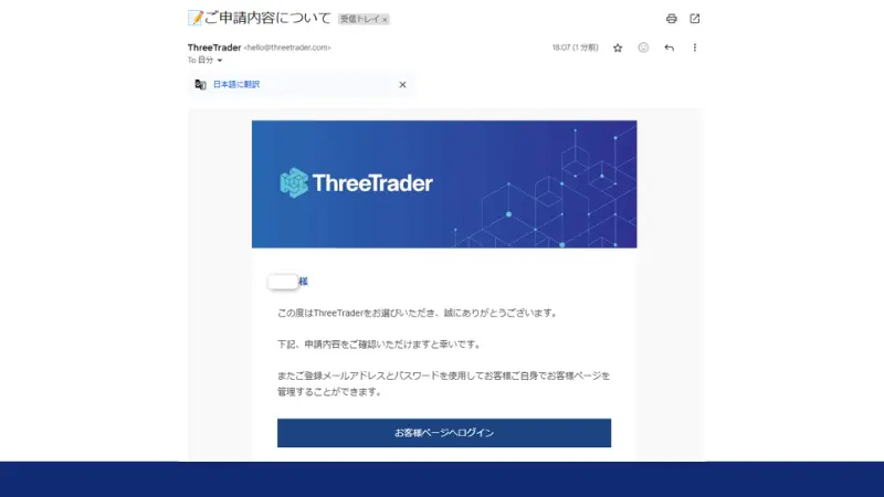 書類のアップロードが完了すると、ThreeTrader(スリートレーダー)から「アップロード書類受け取りのお知らせ」というメールが届きます。